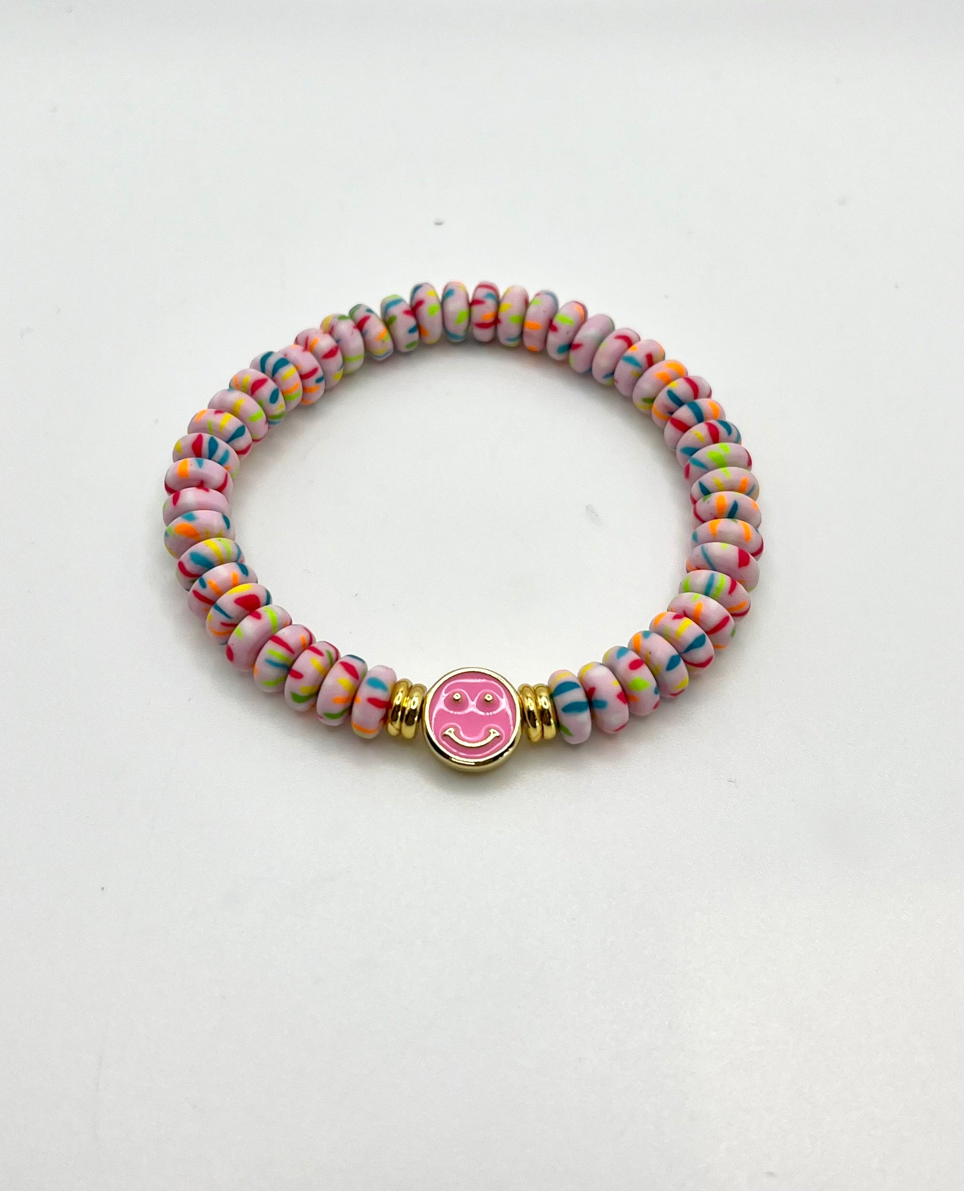 How fun is this confetti colored chunky clay bracelet with our 18K Gold pink enamel smiley face bead! Your little one will love adding this bracelet to her stack!