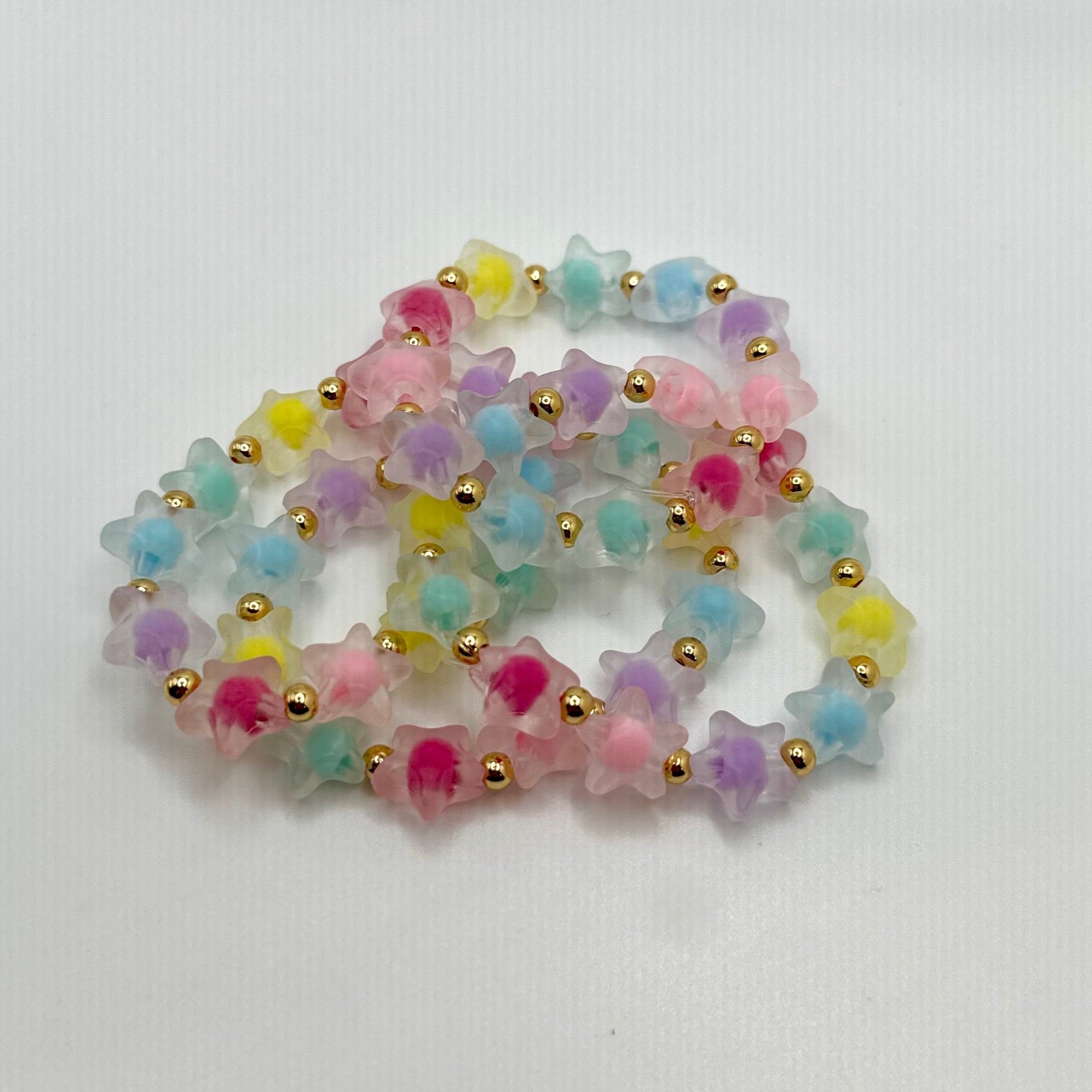 These acrylic pastel stars with our high quality 14k gold plated beads are such a cute addition to your little ones wrist! A cute bracelet they can wear all year long.